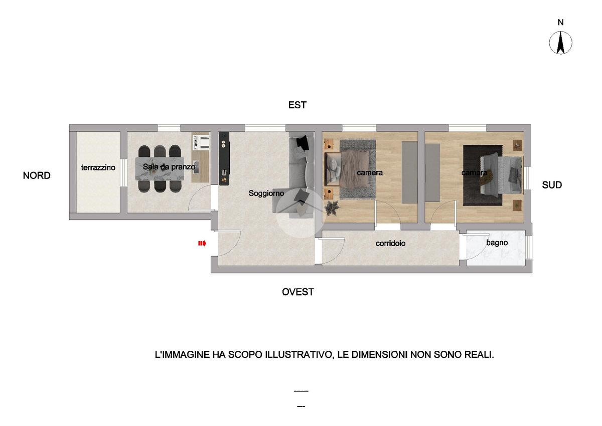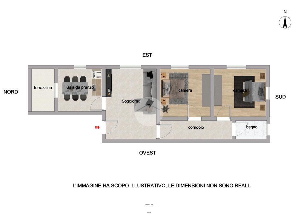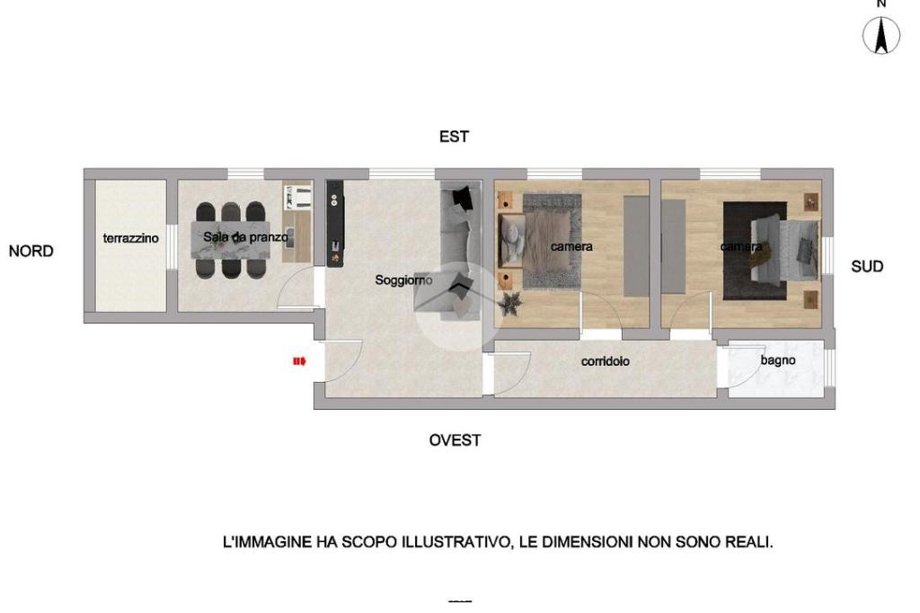 Gli ambienti si prestano naturalmente a un comodo uso residenziale: l'ampio ingresso può facilmente accogliere un luminoso open-space o una pratica cucina separata. La zona notte è già dimensionata per ospitare due vere camere matrimoniali, ideali per famiglie o professionisti.